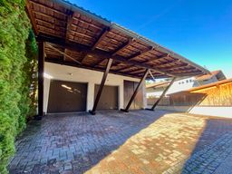 Auch außen zeigt sich der Bungalow großzügig – mit einem Carport für bis zu vier Fahrzeuge, einer Garage (ca. 25 m²) und einer gedämmten Gartenhütte
